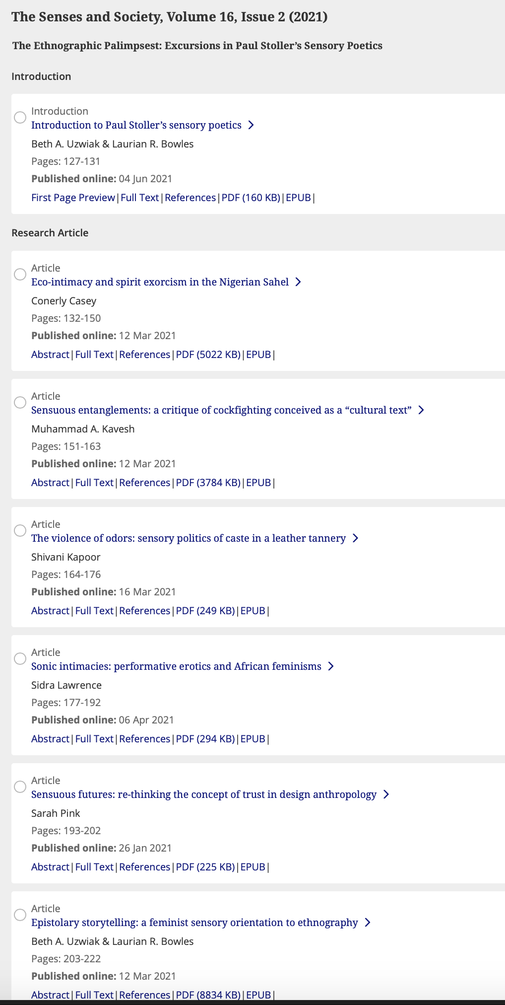 The article is included as part of a special issue Beth and Laurian co-edited: The Ethnographic Palimpsest: Excursions in Paul Stoller’s Sensory Poetics, edited by Beth Uzwiak and Laurian Bowles. Volume 16 (2).